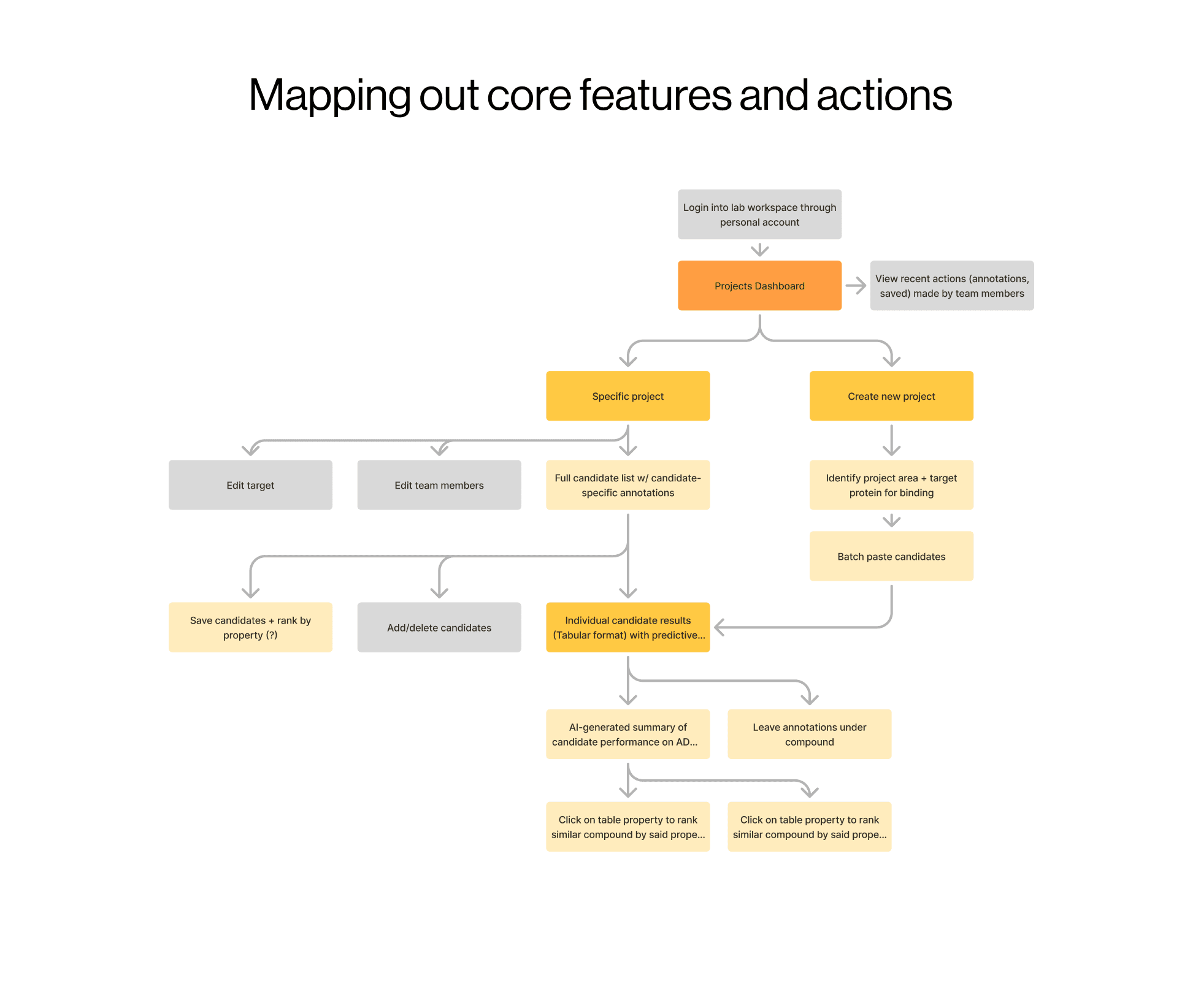 To help our team define our goals and prioritize certain features, I led several brainstorming sessions where we mapped out what a potential software flow could look like alongside a researcher's flow.